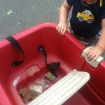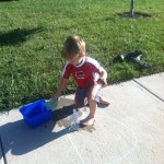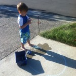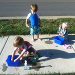 I ended up setting it up with two sets of sidewalk squares with the letters B, C, and D to try to give the big boys separate spaces to work in (I figured I’d put Roman near Jonas since Jonas doesn’t mind his toddler-ness quite as much as Xander does). They each had their own soap pump, washcloth, and bucket of water. Jonas and Xander both had fun running inside to find toys for their squares that started with a certain letter sound. They both also enjoyed being big brothers by finding toys for Roman to wash too. It’s always interesting how these sorts of activities morph…haha…but we all still had fun.