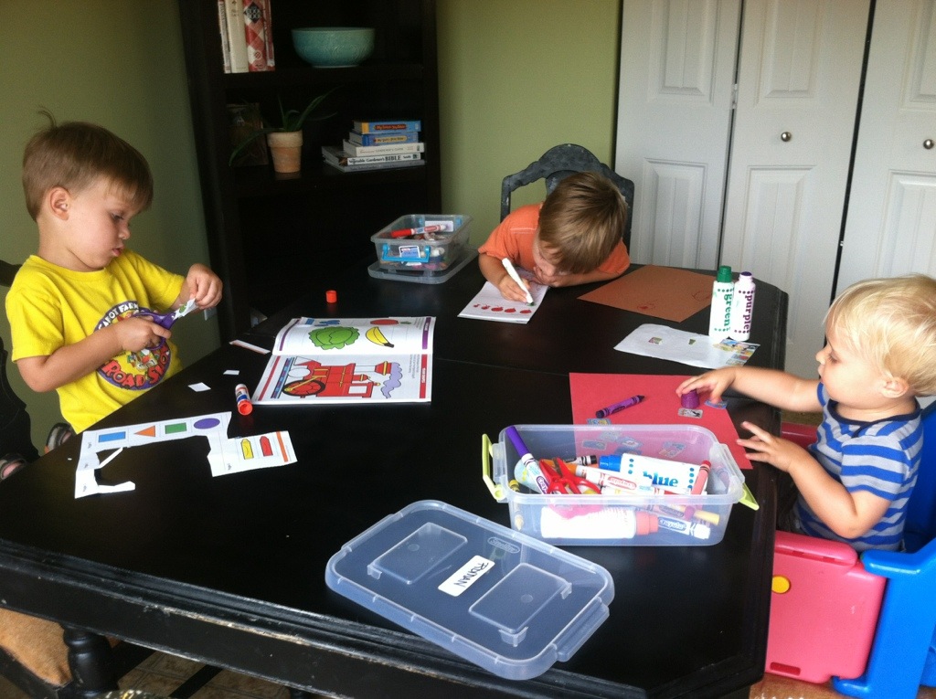 I finally found a set of tracing and cutting books for Xander (he’s totally into both right now) and a beginning math book for Jonas (he’s all about numbers lately). They were both completely engaged with them this morning at the kitchen table…and even Roman stayed in his seat (he is a tireless climber) for stickers and dot markers which are two of his current favorites. Yay for table time!!!