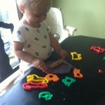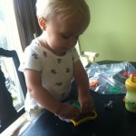 Roman climbed up in the chair this afternoon and had a blast playing with it at the kitchen table. Here he is pushing in the molds, loving on his playdough animal creation, and rolling out the rolling pin. So precious!