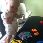 At sixteen months, Roman is: saying “uh oh”, “cool”, “no”, “now”, “fafa” for “waffle”, “hehro” for “hello”, “rara” for “rocket”, and “bow beh” for “brown bear”; becoming fascinated with light switches and fans; loving Little Einstein’s Rocket (the music has captivated him); starting to get really into coloring (he calls it “cuhcuh”); telling me when he has a poopy diaper and sometimes when he’s about to poop (he says “poo”); and continuing to be passionate about books like his brothers (his favorites right now are “Peek-A-Who”, “Look Look”, “The Very Hungry Caterpillar”, touch and feel books, and most recently the kind of books that have little raised parts he can check out like “Five Little Monkeys” and “Five Wishing Stars”.