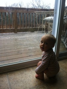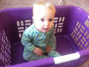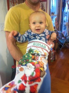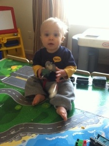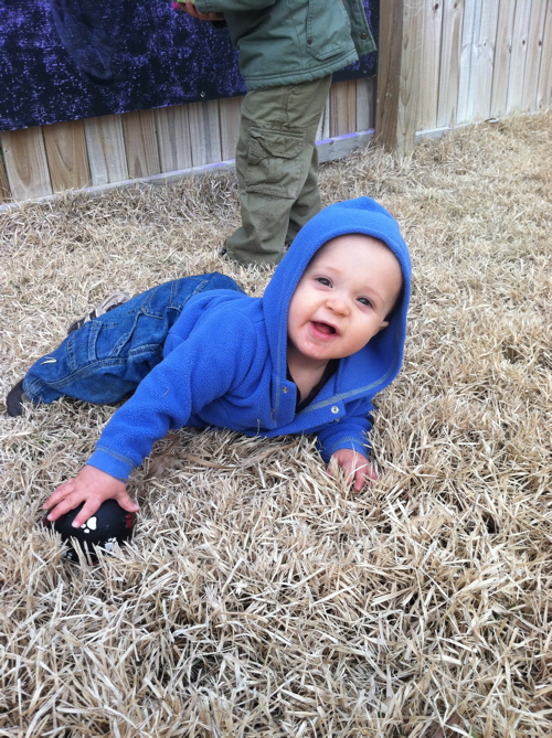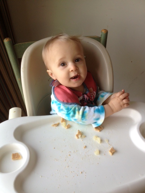 In his forty-eighth week, Roman is: saying “uh oh” (as well as “bye bye” and “DaDa”); joining in with our Jonas-led prayer at the table (it’s the sweetest little prayer that Jonas prays at preschool meal times with his teachers and friends…”Open and shut them, open and shut them, give a little clap, give a little clap, open and shut them, open and shut them, lay them in your lap…God our Father, God our Father, once again, once again, we bow our heads and thank you, bow our heads and thank you, amen…”)…Roman opens and shuts his little hands and claps and even sings and gets a serious look on his face…so adorable!