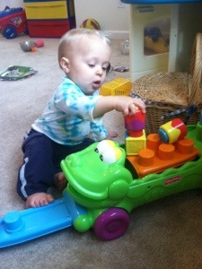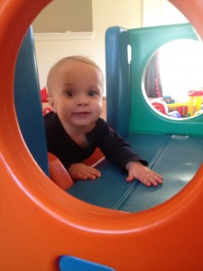 In his fiftieth week, Roman is: saying “cracker”; taking a few unassisted steps here and there; and burning it up on the slide in the bonus room (he crawls up the slide, scoots down the slide, and stands at the top bouncing up and down, playing peek-a-boo and shrieking with delight at his brothers as they play).