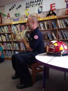 The boys had a BLAST at the NVFD this afternoon with a load of other kids from our moms’ group…checking out the fire trucks and playing in the water from the fire hose. It was so fun (and hot) in fact that several of the moms and dads joined in as well (including Tom and I). Here’s a picture of the boys with Daddy on the fire truck.