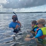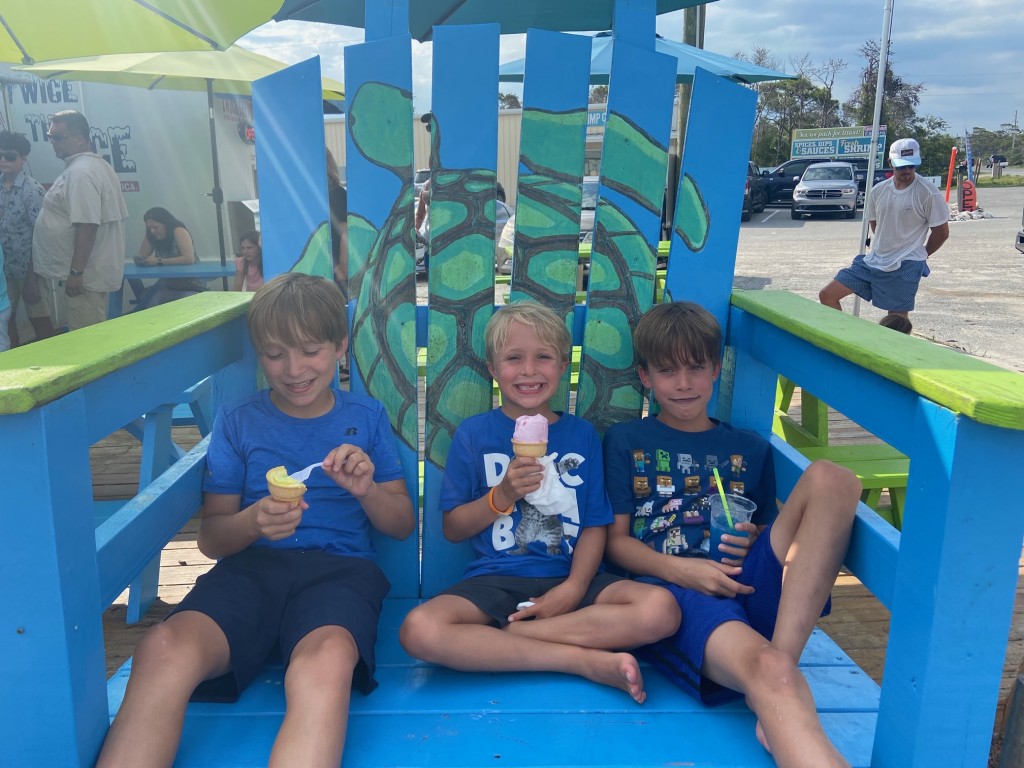 This morning we went to Happy Ours Kayak and Bike Outpost to do some kayaking and snorkeling in the bay. The boys loved it in the past, but today they were CRABBY. Jonas and Xander both helped paddle and took to it pretty well, which was great…they love to race. But, when it came to snorkeling, none of the boys were into it for some reason and preferred to sit on the boat and whine, which just sort of put a damper on things because they were pouting and asking to go home. I just ignored them and enjoyed snorkeling, but Tom ended up having a Come to Jesus with them. I think it helped a little, as they all ended up getting in for a little bit and checking things out. We saw horseshoe crab shells, scallops, a starfish, several schools of little fish, and lots of interesting coral. After lunch and quiet time, we went out for some ice cream at Cape Coffee and Ice Cream (a small local ice cream shop, where if you don’t time it right…will have you waiting in a line wrapped around the parking lot). So yummy! We swam in the pool until dinner time and then headed down to the beach at sunset for a game of football and one more round of pictures (we needed to get a good one of the whole family).