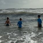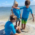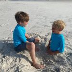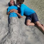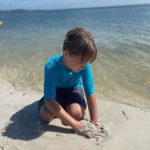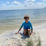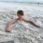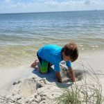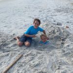 So, we packed up and headed for the bay in St. Joseph Peninsula State Park (which is a minute or two from where we’re staying). We set up our canopy on the very small shore (a lot of it washed away in Hurricane Michael 2 years ago, so they’re still rebuilding it) and took off in the water to do some snorkeling. Roman wanted to try to catch fish in his net, so he did that along the way instead. I ended up joining him later on (he caught two hermit crabs!), while Tom and Jonas and Xander continued to snorkel and worked on building a huge sand castle. Afterwards, we headed back to our canopy for some shade and snacks. The boys were asking to go home at this point, but they ended up getting into burying themselves/each other in sand and looking for hermit crabs, while Tom snorkeled and I sat reading under the canopy.
