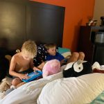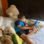 Here are some pictures of play time/screen time in the room (Jonas and I playing Dragonwood…such a cool game, Xander and Roman playing stuffed animals…that got a little crazy, and all of the boys cozed up with their stuffed animals, doing some tablet time).