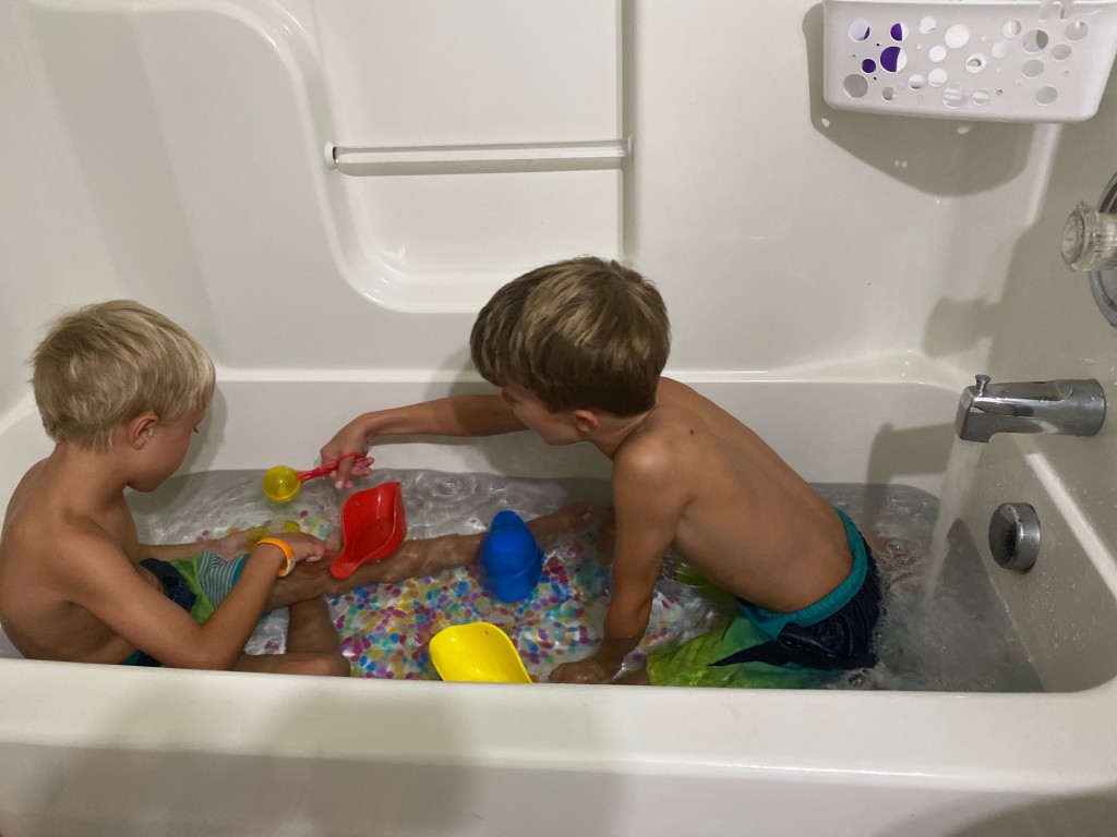 Xander and Roman started playing with the water beads, and it morphed into them dumping the orbeez into the bathtub, putting on their swim trunks, and playing peacefully together for about an hour. It reminded me of when they were little. ❤️