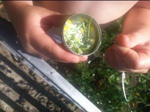 Jonas and I were toodling around in the backyard this afternoon, watering the garden and checking out the growing things, while Xander and Roman were taking an afternoon nap. I showed him the chamomile that came back from the seeds we planted last year. He was SUPER excited and said, “Like chamomile tea…like Peter Rabbit?” and wanted to know if we could make some chamomile tea. So, we did. He loved cutting the flowers, putting them into the tea infuser, steeping it in a cup of hot water, adding some of MeMe’s spiced apple cider honey, and taking sips over and over again. Who knew I’d have a fellow herbal tea enthusiast in my four and a half year old son? Love it…love him.