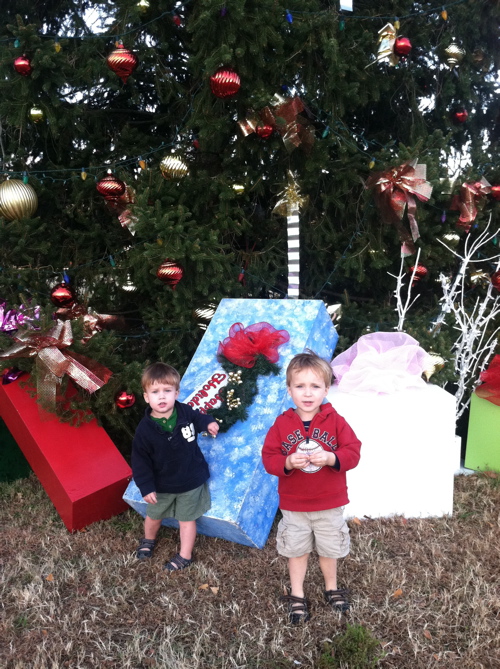 We have a new addition this year…a little Christmas tree in our play room. Tom bought some shatterproof ornaments, I strung them with sparkly ribbon, and the boys had a BLAST decorating the tree all on their own.