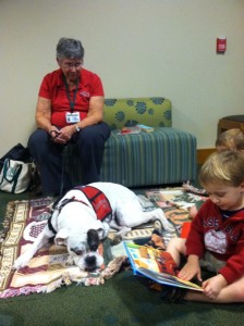 Lily is a READing Paws dog, and she loves to listen as children read stories to her. Jonas was a little shy at first and wanted me to sit next to him, but once he started reading he was just fine and seemed to enjoy it just as much as Xander, Lily, and I did. I can’t wait to take them back and make it a regular thing.
