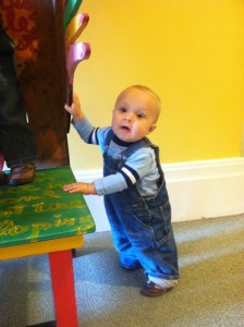 In his thirty-ninth week, Roman is: continuing to rip off his bib at mealtimes (he’s been doing this for a while now, and it totally wears me out…I finally got him a bib with a stretchy collar for toddlers); putting the turbo on when he crawls; pulling up on and cruising around anything and everything; climbing the stairs (all the way to the top with Daddy right behind him…God help us); and proving to be every bit the explorer that his brothers were at his age (and still are).