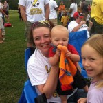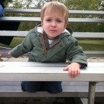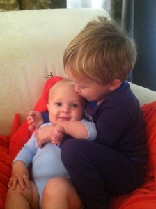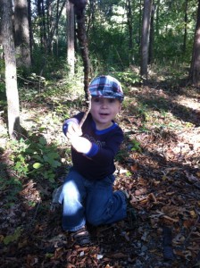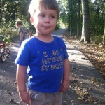 Here’s a sweet picture of Tom and Xan-Man on the nature trail in our neighborhood…aw…love. And here’s one of Xander in a shirt that I thought was really apropos, being as you can see the bruise on his nose from where Jonas tossed his sippy cup to him and missed AND the cut under his lip from where he fell, standing on the stool in the bathroom, brushing his teeth…poor guy…but no worse for the wear.