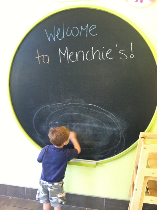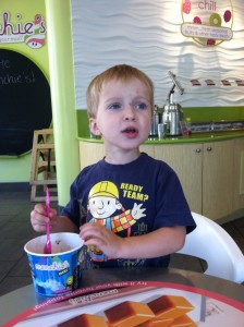 Lately, we’ve been working with Jonas on following directions. Every time he follows directions, he gets a pom pom in a small jar. When the jar is full, he gets a treat of his own choosing. For his first treat, he wanted to go to the frozen yogurt place we pass every Saturday morning on the way to the grocery store. We stopped off after our grocery shopping, but they weren’t open yet (we were about fifteen minutes too early). So, I told him that we could drive to another frozen yogurt place on the way home that was already open. He REALLY wanted to wait for the “happy ice cream” (see the sign below), so we ended up staying. He had a small amount of chocolate, vanilla, and cookies and cream all mixed together, which I thought might not send him spiraling into super-cranky-post-sugar-eating Jonas, being a small amount, but it did. Oh well…it was a sweet moment while it lasted.