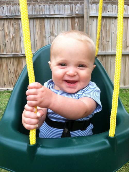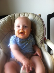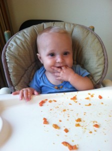 At thirty-one weeks, Roman is: outing with his first consonant/vowel combination, “babababa”; doing his first sign for “milk”; trying peaches and avocados; pretty much refusing to be spoonfed (we’ve settled on a mix of finger foods and purees right now, though, because he’s still not quite ready for only finger foods even though he wants to be); and spending a lot more time playing sitting up instead of playing on his tummy.