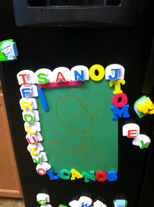 Here’s one of his drawings that he put up on the refrigerator and hung with magnets, sounding out and trying to spell, “Jonas Seyfried loves volcanoes”.
