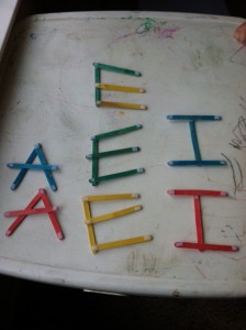 My moms’ group had a Busy Bag Exchange that was such a great idea…a bag of cheap, easy, and educational entertainment to pull out for your toddlers and preschoolers at doctor’s offices, restaurants, etc…Jonas loved this one (popsicle sticks and velcro) and went right to work making letters.
