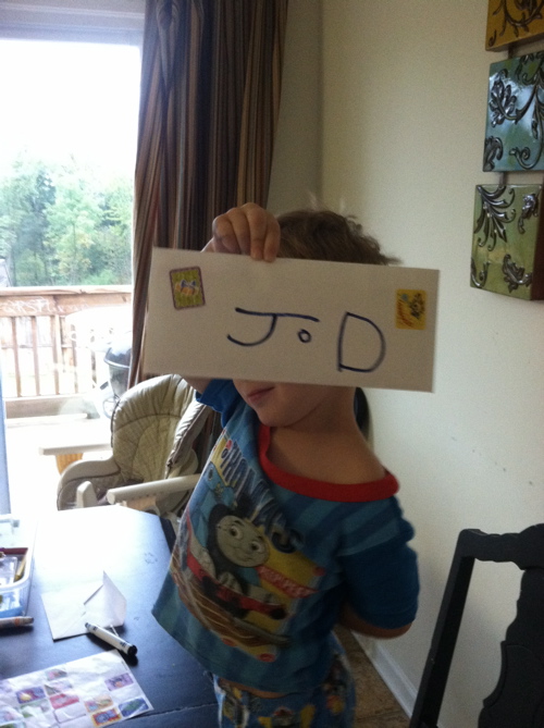 We also watched a Caillou episode the other day where Caillou’s mom wants to get “real mail” instead of bills, advertisements, and such…so he writes her a letter. Here’s one that Jonas wrote for me and put in an envelope, complete with sticker stamps and my name…aw!