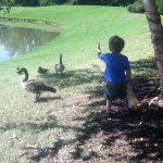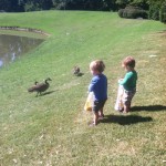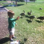 We had a bunch of stale bread (heels that, despite the best of intentions, didn’t get eaten) in the pantry, so I took the boys this morning to feed the ducks. They were delighted (boys and ducks alike).