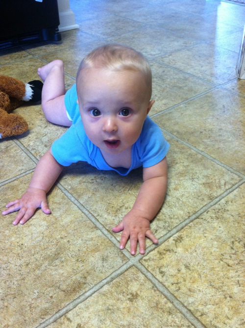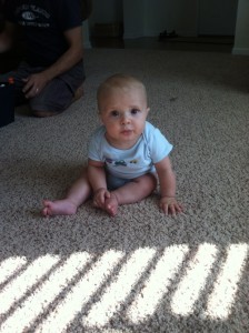 In his twenty-eighth week, Roman is: continuing to be watchful of and smile at the signs for “milk”, “eat”, “drink”, and “change”; trying green beans and peas (he LOVES peas); developing an affinity for shoes (we have to be really diligent to keep them up off the floor because he has a homing beacon for them and they go straight in his mouth…yuck…it must be a texture thing); and starting to pat his knees, legs, and the floor (one of my favorite baby things).