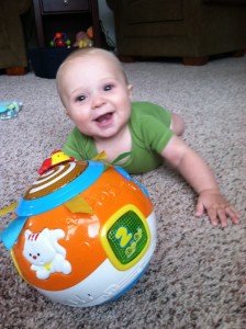 In his twenty-fourth week, Roman is: starting to narrow his night time feedings down to two (most nights…some nights…a few nights), trying out the sippy cup (he loves it and has already figured out how to get water out of it), ARMY CRAWLING (crazy…I know…he went from perfecting the mini push up to lifting his chest all the way off the floor and pivoting to getting up on his knees and pushing forward to putting it all together in one week), and bucking like a bronco when you try to put him in his car seat and when he’s been in the Bjorn facing out (his favorite position right now) for longer than he wants to be.