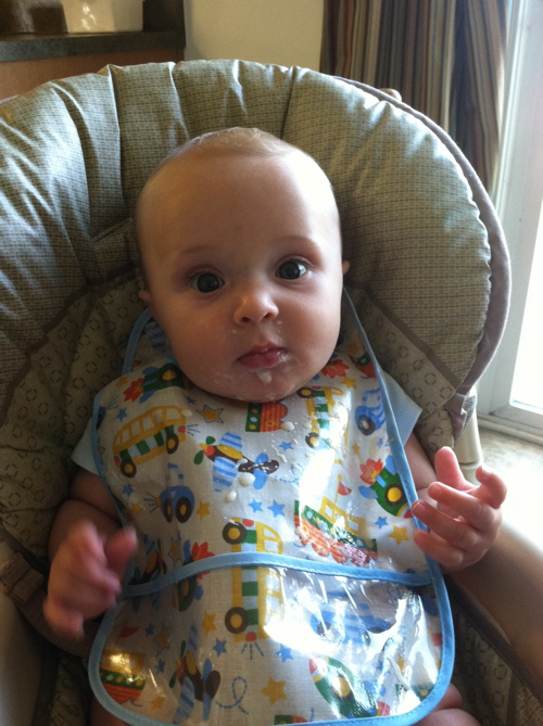 At twenty-five weeks, Roman is: giving sweet baby bear hugs, starting solid foods with rice and oatmeal cereal (he LOVES it and is already going for a second helping), tripod sitting with assistance, trying to roll away from the diaper change (wait a minute…I thought this happened a little later in babyhood…oh well, at least he responds well to the “Here, hold this” trick), and glory of glories…going his longest stretch between feedings at night since he was born (7 pm to 2 am).