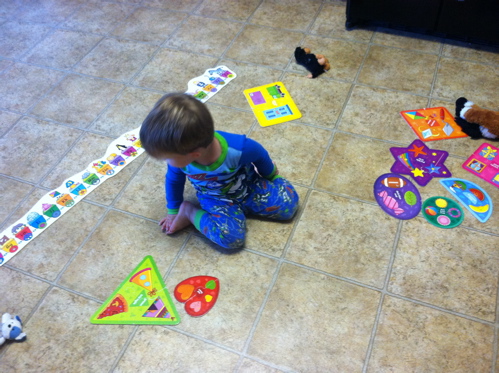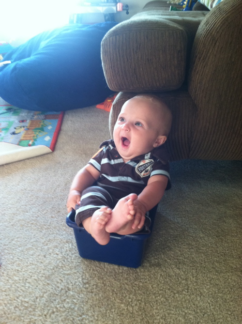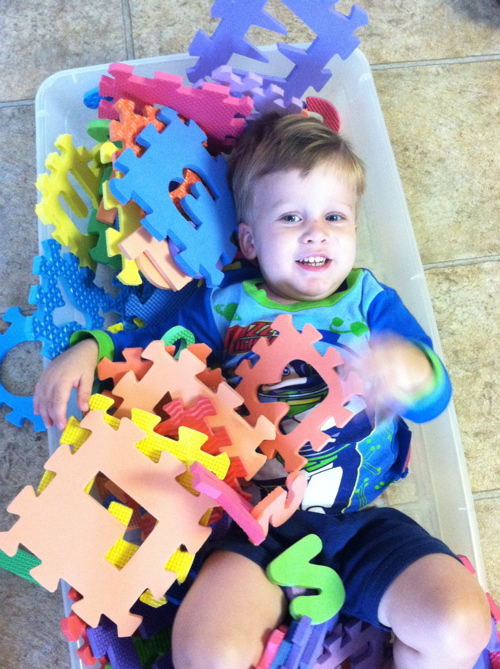 Xander is such a funny little boy…he loves to be right in the middle of anything and everything…literally. He and Jonas were having a rip roaring time this morning running the pieces to this foam letter puzzle back and forth from the living room to the kitchen. Afterwards, I tried to make a game of putting the puzzle pieces back in the container (a game Xander loves right now), and he ended up thinking it would be more fun to just dive in and have the puzzle pieces put in on top of him. He was right…it was. Thanks to my little guy for making everyday life fun…