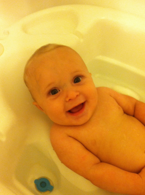 In his twenty-sixth week, Roman is: trying his first homemade vegetable puree (sweet potatoes); dropping his late afternoon nap (it seems way too early to me but he is serious about it); emerging as our first blond-headed hazel-eyed baby boy; and enjoying games of peekaboo in his crib before his bath and with his towel after his bath (he started this one much to my amazement).