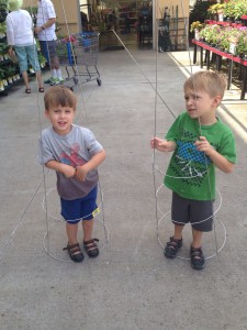 The boys and I stopped into the garden center this afternoon to pick up a few perennials for our front flower bed (I think I’m finally realizing that swapping out annuals twice a year is not worth the time or the money). We grabbed some tomato cages while we were at it for a few of the tomato plants in our garden that have started getting big. And I cracked up when I looked over and saw this…they said they were “growing themselves”.