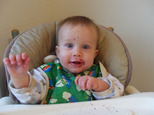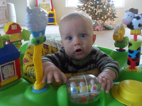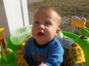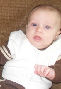 What a BIG week for Xan-Man!!! In his thirtieth week, Xander is: trying pears; champing out with his first finger food (sweet potato puffs); cutting two teeth on the bottom; rocking back and forth on his hands and knees; sitting up unassisted for short periods of time; communicating with what appear to be his first two signs (“milk” and “change”); and making us smile with his first consonant/vowel combination (“DaDaDaDaDa”).