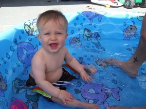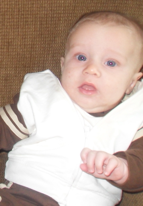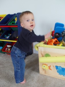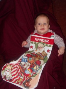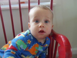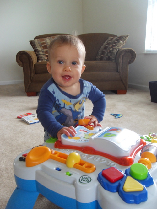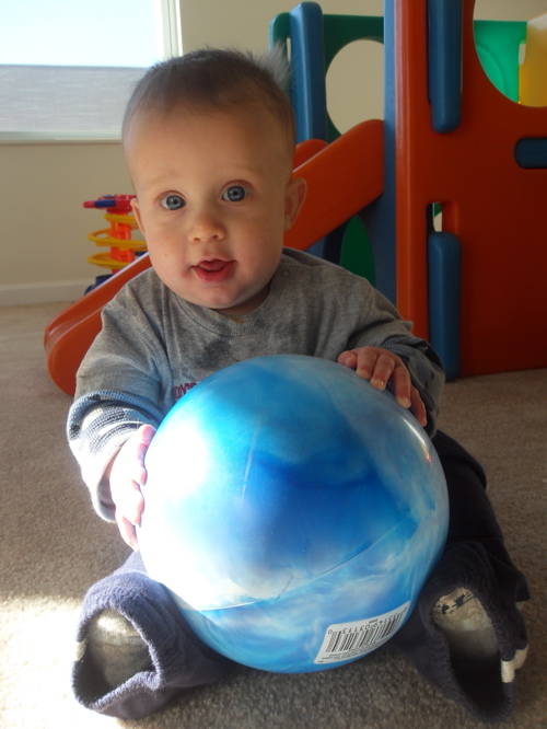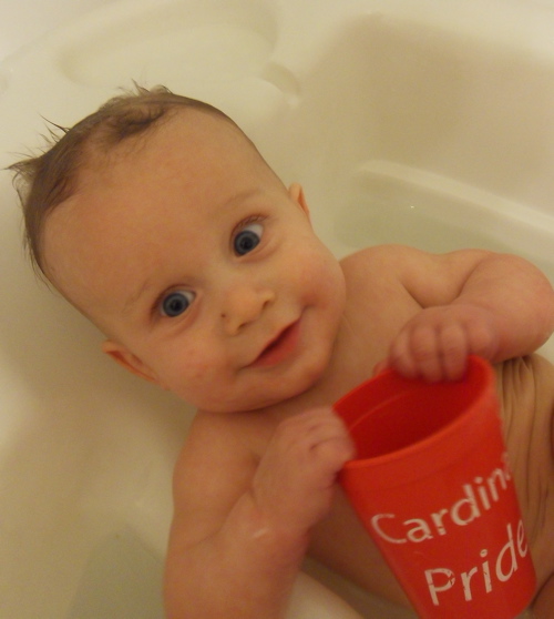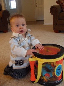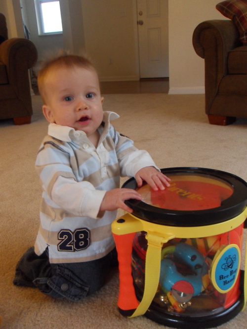 In his thirty-fourth week, Xander is: pulling up to standing; doing his own versions of the signs for “drink” and “milk” (and getting really excited when he realizes we understand); figuring out how to drink from his sippy cup (and smiling and laughing when he successfully takes a drink); giving the most precious hugs in the world when it’s been a little while since he’s seen you; sleeping through the night for the first time (the 7:30 pm to 6:30 am kind…yes!!!); pointing with his index finger to push buttons, tug on your lip while he’s drinking his bottle, and investigate toys (and totally reminding me of ET); and keeping such a steady beat with his leg when he’s happy that I think we might have a little drummer boy on our hands (for real…we were at a picking at the Wingates’ house and he was banging a toy on the floor in perfect time to the music and even kicked into the back beat for a little bit).