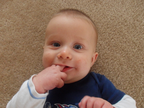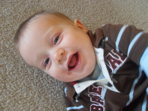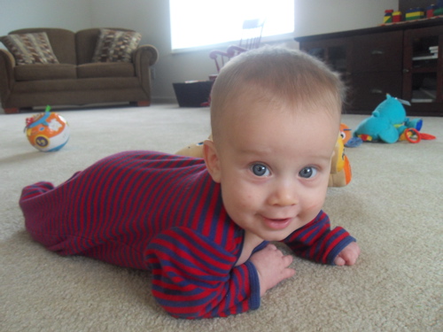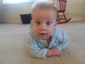 At twenty-four weeks, Xander is: sleeping for longer stretches during the day and night (kicking the 30 to 45 minute nap up to the occasional 1 to 2 hour nap AND knocking out 7 to 8 hours straight at night…YES!!!) and starting to lunge forward instead of push backwards when he’s up on his knees (I think we have a crawler on our hands).