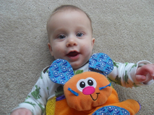 At twenty-five weeks, Xander is: adding a toe push to his forward lunge, which makes me think he’s going to be an army crawler; developing a fascination with the soft and silky tags on his toys (blanket teether, rattle, and stuffed animals); and getting just as excited about reading books as he does about eating and taking a bath (which is REALLY excited).