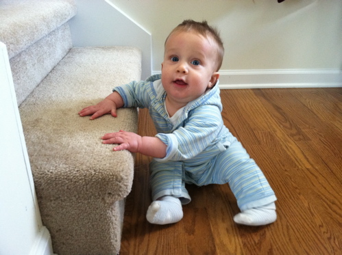 At thirty-five weeks, Xander is: adorably saying “dadada”, “mamama”, “vavava”, and “bababa”; loving his milk…he can tank it back (mostly hypoallergenic formula with a bit of breastmilk added in, although I think my exclusive pumping days are quickly coming to an end); adding a morning snack to his afternoon snack and three meals a day (the boy can eat…I guess he’s burning off all of those calories by being so active); clicking his tongue; starting to crawl off of his belly on his hands and knees (we’ll have to post a video of him army crawling so you can see how he’s been doing it for two and a half months); and flirting with the stairs (I honestly can’t believe this fascination has started already).