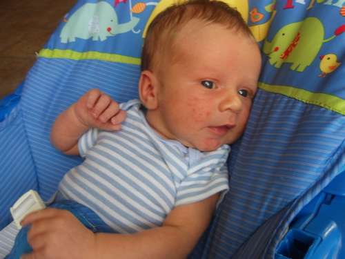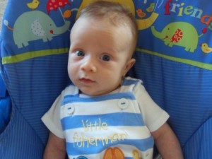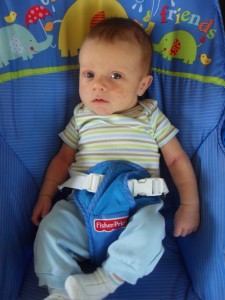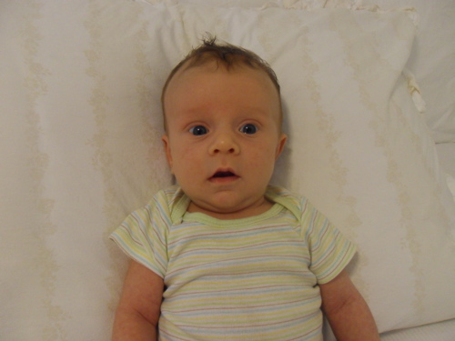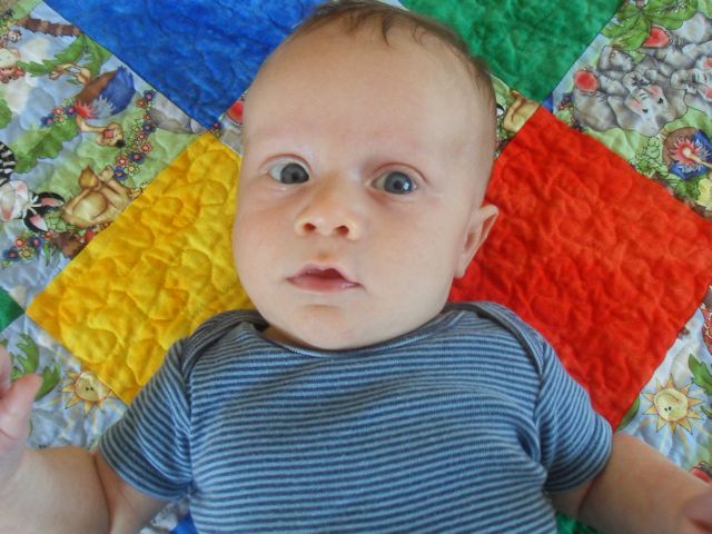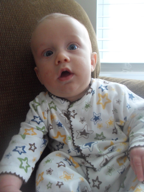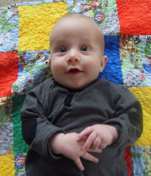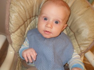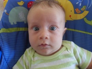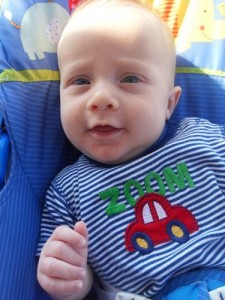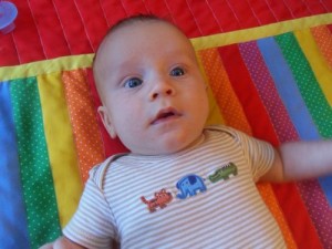 At thirteen weeks, Xander is: adorably crooking his arm around his bottle, while holding onto it with one hand and holding onto my hand with the other; responding well to MaMa’s new dairy free diet; taking his first road trip (to Virginia to visit Grandma and Grandpa and to be baptized); lengthening his awake time during the day; giving us an eight hour night’s sleep; being introduced to his first three signs (milk, change, and sleep) and taking a keen interest in them; rocking his bouncy seat with his hearty kicks; and almost laughing out loud at Sandra Boynton’s Barnyard Dance.