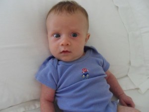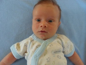 At nine weeks, Xander is: growing like a weed (we cracked up when we discovered that he already had size 2 feet, when we were consignment sale shopping a few weeks ago); passing his hearing screen (yay!!!); strengthening his suction every day with his bottles of breastmilk (we meet with lactation next week and are hopeful he’ll be able to nurse again soon); and emerging as quite the little clock when it comes to his daily routine of eating and sleeping.