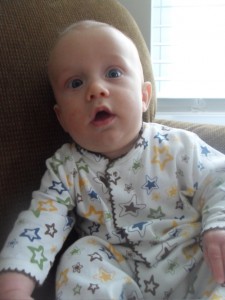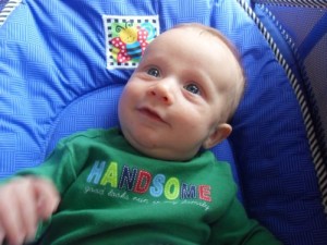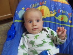 At nineteen weeks, Xander is: launching headlong into teething; trying solid foods with a little bit of organic rice cereal (although he’s very enthusiastic about it, he’s not quite ready yet…so we’ll give it another go in a few more weeks); rocking his bouncy seat with his hearty kicks; really working on his attempts to roll over from his back to his belly; smiling every time MaMa lowers him into the bathtub for his bath; and playing games (it’s amazing…he puts his hand in MaMa’s mouth so she’ll play like she’s eating it, laughs out loud, pauses and smiles, and then does it again).