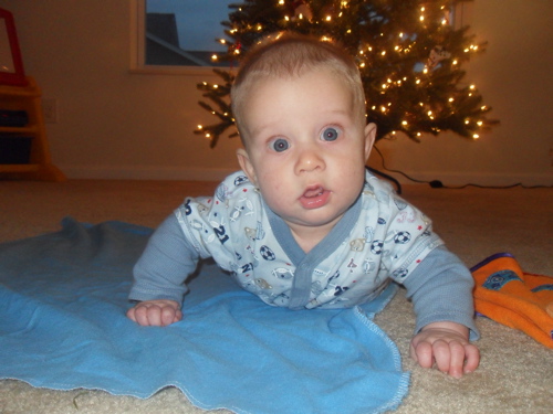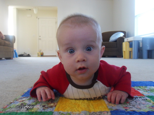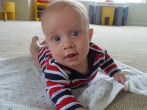 In his twenty-second week, Xander is: having a blast rolling around on the floor from back to belly and from belly to back; eating two tablespoons of organic rice cereal in the mornings and in the evenings and loving it (this is probably THE most excited he gets during the day to the exception of bath time); tracking with a few new signs (eat, more, book, music, bath, and massage); enjoying his musical mobile; starting to wake every 5 to 6 hours at night (instead of every 3 to 4 hours)…yay!!!!; and discovering his first favorite toy (his orange and blue teething blanket)