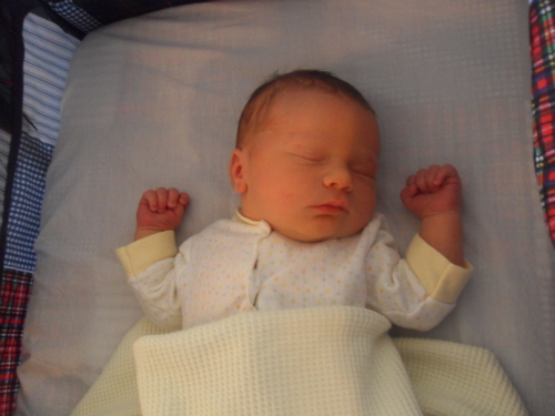 At one week, Xander is: already showing incredible strength in holding his head up and in keeping his hands and his fists as close to his face as possible; preferring not to be naked (he’s not a fan of the diaper change or of the bath); enjoying sleeping on his side (he doesn’t seem to be a swaddle guy) and putting away some serious zzzs; and still getting the hang of the whole nursing thing.