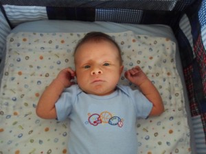 At two weeks, Xander is: already going three and a half to four and a half hours between feedings at night; smiling socially a little bit (for real…it’s not gas); starting to hit his stride with nursing; amazing us with how alert he is when he’s awake; and starting to develop a sweet sleep/awake routine (napping when Jonas takes his afternoon nap and hanging out with MaMa and DaDa for a bit after Jonas goes to sleep for the night).