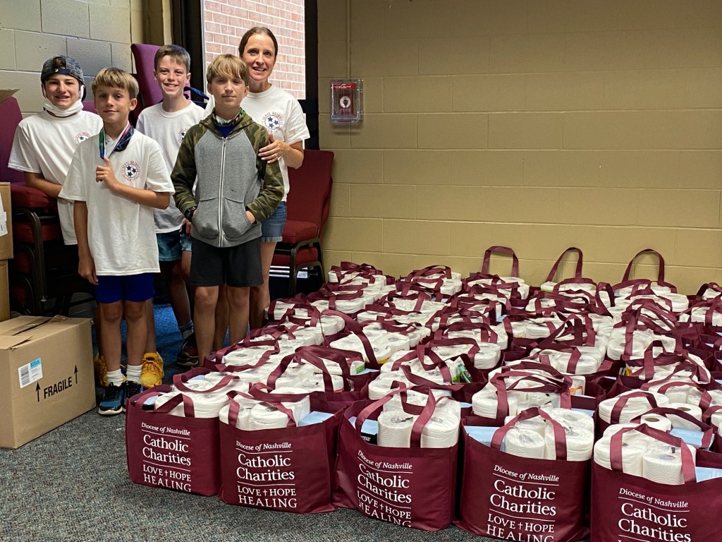 Jonas had a hard time not chasing the chickens the entire time, so even though it ended up being a lot more driving, I was somewhat relieved (if a little frustrated) when the youth leader asked me if I could take the boys out to Catholic Charities in North Nashville to help out there instead. So, we loaded back up into the van, the boys ate their lunch and cracked jokes, and we arrived at our destination about 45 minutes later. We ended up filling 60 bags for the elderly leaving rehab…it was the perfect job for the boys (and for me). I was so proud of their willingness and their ability to work together to get the job done.