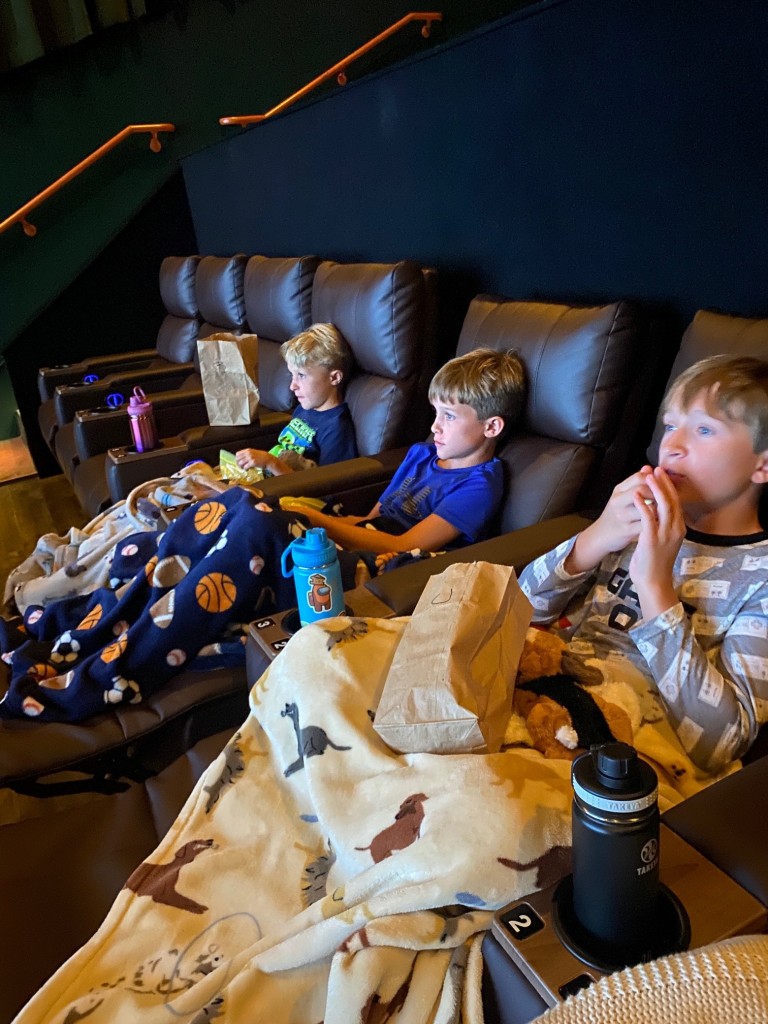 I took the boys to see a movie today…we were pretty much the only ones there! They love to bring their blankets and stuffed animals and enjoy their homemade treat bags with popcorn and fruit gummies. (I can’t even believe how comfortable movie theater seats are nowadays…I’m surprised I didn’t take an afternoon nap!)
