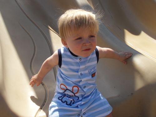 In his sixteenth month, Jonas is: Â adding even more words to his already amazing vocabulary (“tee” for “tree”, “goo guh” for “good girl”, “choo” for “shoe”, “cap” for “clap”, “cah” for “(dog) collar”, “momah” for “snowman”, “moh” for “more”, “i yah” for “i love you”, “tall” for “tall” and “talk”, “two”, “crakah” for “cracker”, “coo coo” for “cookie”, “ih neh” for “empty”, “aht” for “hot”, “no no”, “gentuh” for “gentle”, “nih nih” for “night night”, “peace” for “peace”, “piece”, and please”; and “wal-mah” for “wal-mart”); using a few new signs (“all done”, “change diaper”, and “thank you”); making valiant (if messy) efforts to use a spoon; spending more time scribbling with crayons than trying to eat them; wildly enjoying games of chase with DaDa and Petra; being a brave boy with his biggest boo boo to date (he fell at the dog park when he was running towards me and out came the largest goose egg on his forehead that I have ever seen); turning into quite the little spontaneous, heart-melting, snuggle bunny; going up the stairs walking instead of crawling; showing us all of the “no nos” in the house with a quick run to the site of offense and a passionate “no no” upon arrival; pointing to himself when you ask him where Jonas is; and continuing to explode with personality.