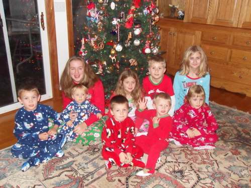 Here’s a picture of Jonas with all of his cousins on his Daddy’s side of the family…all dressed in the footie pajamas that Grandma Jackie bought them for Christmas. Â From left to right and front to back are The Seyfrieds (Lindsey, Jonas, and Audrey), The Longs (Andrew and Kaitlyn), and The Paccassis (John, Peter, Sam, & Lily).