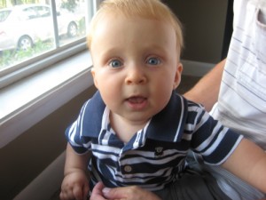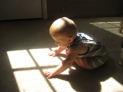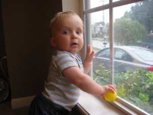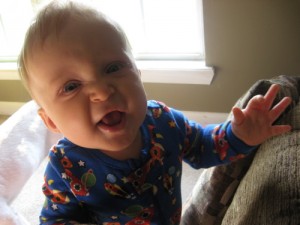 As a forty-one week old, Jonas is: meeting another vegetable he loves (zucchini); hitting a major growth spurt with all that that entails; greeting his awake time with amazing bursts of jabbering and crawling energy; figuring out that DaDa is the “dada” he’s been babbling about; shaking his head no with great understanding; making the signs for “milk” and “drink”; giving us things we ask for (sometimes), to our amazement (his pacifier, as it’s only a naptime and bedtime thing now, and his favorite toys); working on his balance by standing with both hands free for a few seconds at a time; and asserting his strong will and discovering his independence.