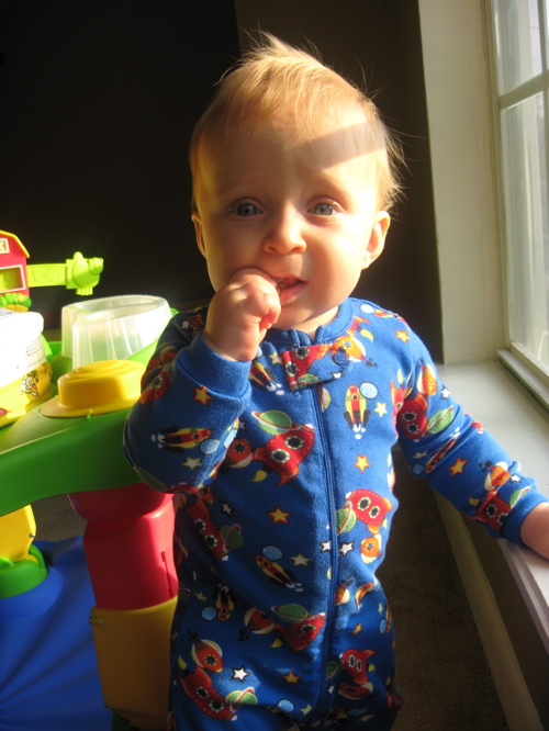 Yesterday was such a sweet day for Tom and I with Jonas. Â He sent Daddy off to work with a big boy farewell, in his new favorite rocket ship pajamas with one hand holding on to the baby gate and one hand straight up in the air waving back and forth. Â And when I went into his room to bring him downstairs to play after his morning nap, he stood up in his crib, held on with one hand, waved at me with the other, and said, “NaNa”. Â He wins my heart every day, over and over again…just like his Daddy.