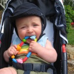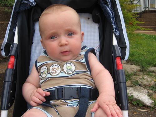 The latest Jonas developments are: Â being successful most of the time at putting his pacifier in his mouth all by himself; Â pulling a 9 hour night (it was stand alone, yes, but still…we know he’s got it in him); finding his thumb and sucking on it backwards; continuing to eat like a champ (I can’t wait to see how much he weighs at his 6 month check-up); making a very understandable spit out/shiver face when he takes his liquid vitamins with iron; making his first sign (with prompting) for “milk”; showing more and more strength when it comes to sitting up on his own; coming really darn close to rolling over; working on his crawling skills by getting his knees up under him during tummy time (he’s still figuring out how to not do the otter thing with his arms); reaching for Dreemer; pinching and grabbing anything and everything in sight; and enjoying his outdoor walks.