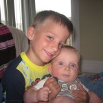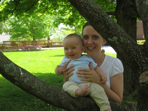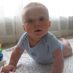It has been a very eventful week for Jonas, full of transition and big boy things seeming to happen all at once…he: rolled over for the first time (back to front); officially graduated from a swaddle to a sleep sack; greeted his first Mother’s Day with an out-of-character, not-so-easily-consolable bout of fussing that ended up being the culmination of his biggest and longest growth spurt yet and tipping his Mom and Dad off to the fact that he was just plain old hungry, hungry, hungry; started solids with his first bowl of whole-grain rice cereal; said goodbye to his dear friend Dreemer; exhausted his Mommy’s store of extra breastmilk in the freezer; weighed in at a whopping 16 pounds and 13 ounces at his 6 month checkup; experienced his first taste of vegetables (sweet potatoes, homemade by his Aunt Heather) as part of his second solid food meal of the day recommended by his pediatrician; began discovering a new favorite sleep position (an extreme form of side sleeping that looks like it wants to be tummy sleeping soon); made his first sign, without prompting, for “milk”; gave many squnched-up-nose smiles with the most endearing pattern of open-mouthed breathing when he felt full of love for something or someone; launched headlong into teething; and uttered, more than once, what we’re wondering might prove to be his first word…”hi”.