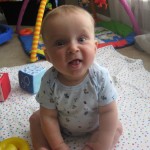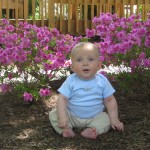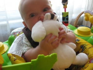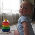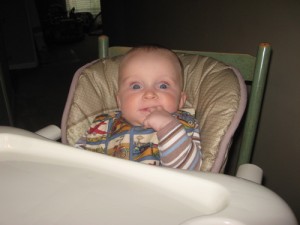 Here is the latest and the greatest in the world of Jonas Benjamin Seyfried: Â helping Mommy and Daddy out by leaning forward to have his bib snapped on or off AND to get out of the shoulder straps of his car seat and jogger stroller; figuring out how to put his uni-directional pacifier in the right way (it’s amazing how his wheels are always turning); scratching to explore different textures; trying out a new vegetable (green beans); attempting to strong arm the spoon away from whoever is feeding him; sampling cold water in his sippy cup; talking, humming, and singing himself to sleep; skipping out (more often than not) on his third nap of the day; having the time of his life playing peek-a-boo in his crib; starting to protest when we leave the room and when he drops a favorite toy; and making signs on his own for “milk” and “eat”. Â