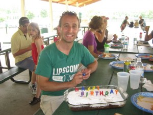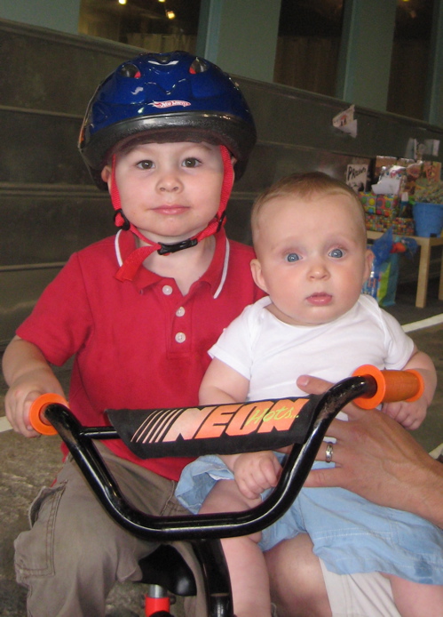 Here is a picture of Jonas and Nate.  Nate is the son of Jeff Chandler, who is Tom’s business partner.  Jeff and his precious wife, Michelle, threw the coolest birthday party EVER for Nate’s 3rd birthday at the Genesis Auto Brokers warehouse, complete with a homemade race track for the little ones to ride around on, amazing car-shaped cakes for the kids to decorate, and a full-screen showing of the movie “Cars” projected onto a giant wall for young and old to enjoy.  It was a great way to kick off the summer.  🙂 Â