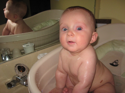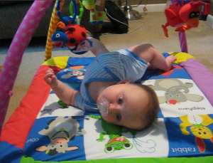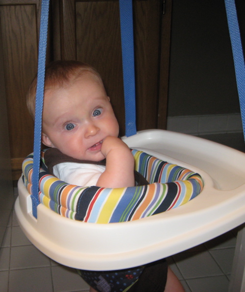 Recent developments for our little man include: Â rolling over from front to back; sitting up (not leaning back) in his bouncy seat, stroller, and car seat; working on his crawling skills; bouncing around like a pinball in a pinball machine in his pack-n-play; making his second sign with prompting for “eat”; moving up from 2 tablespoons to 3 tablespoons of rice cereal and vegetables at his morning and evening meals; adding squash and carrots to his repertoire of vegetables; being really serious about his big boy meals by letting us know with an intense grunt when he’s ready to eat and when it’s been too long in between bites; pounding his chest with both fists like Tarzan; exploring different textures with his hands; continuing to perfect the art of the raspberry; debuting what seems to be his first consonant/vowel combination, “nay-nay-nay-nay”; and becoming more and more alert to and aware/observant of his environment (to my delight, he just noticed the monkeys on the feet of his “go bananas” sleep-n-play).Â